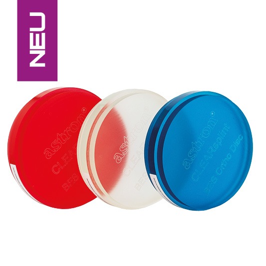 Astron® CLEARsplint® BES Ortho Disc eignet sich für hochästhetische, gleichzeitig thermoaktive kieferothopädische Apparaturen mit Memoryeffekt für ein Mehr an Tragekomfort. Anwendungsbereiche: Vorschubdoppelplatte, Aktive Platte, Bionator